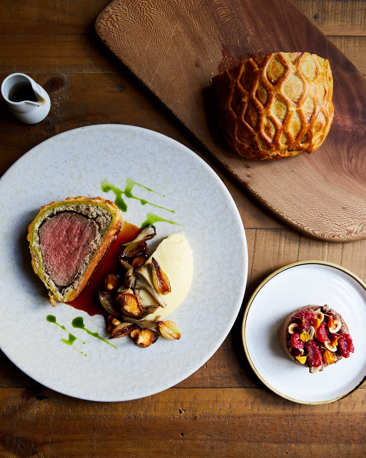 Starter - Confit chicken, potato roti, wild garlic & smoked yolk, or Rosemary gnocchi, pumpkin, tarragon & wild mushrooms (v)