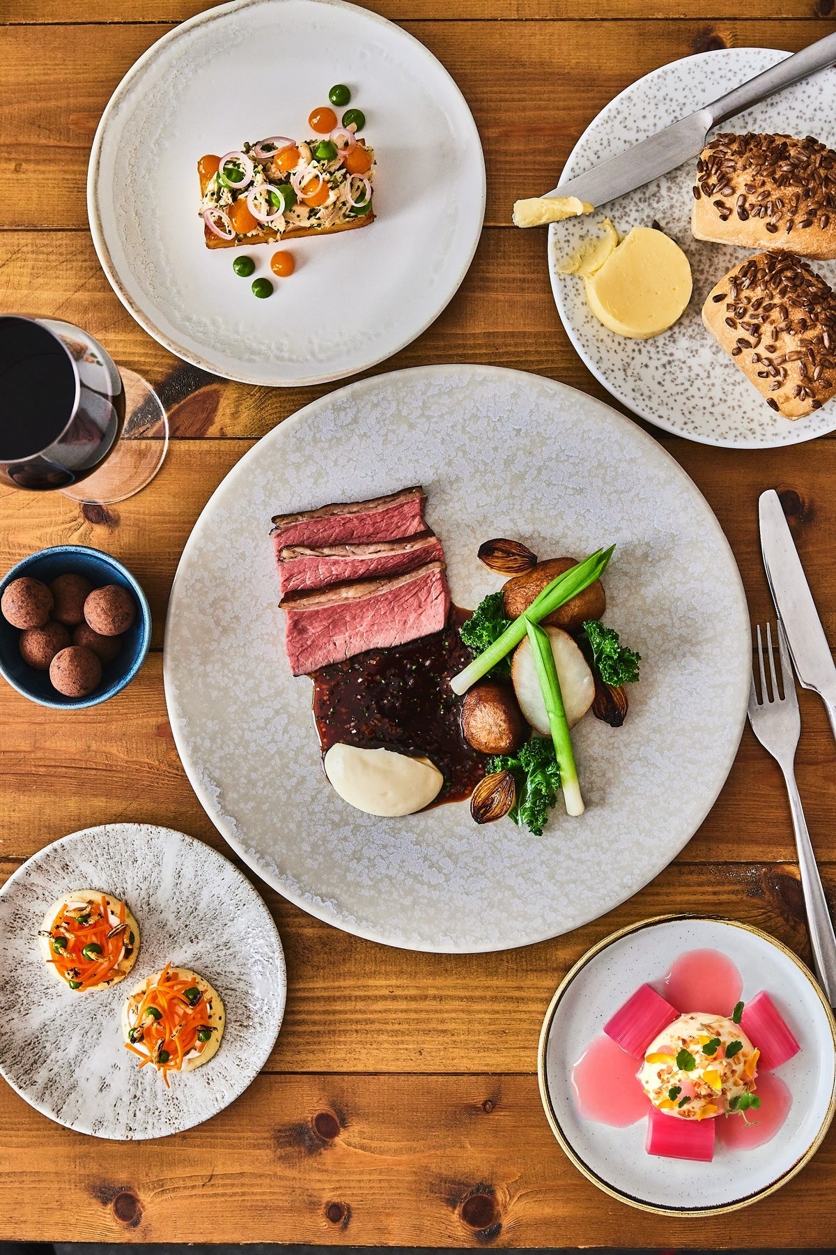 Main - Beef rump cap, Jerusalem artichoke, baby leeks & Bordelaise sauce or Caramelised onion, spinach, ricotta & sunflower seeds (v)